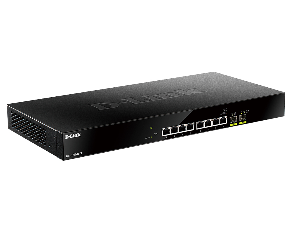 Управляемый коммутатор DMS-1100-10TS оснащен 8 портами 10/100/1000/2.5GBase-T для подключения по витой паре, а также 2 портами 10GBase-X SFP+, применяемыми для организации подключения к высокоскоростной магистрали. Благодаря поддержке технологии 2.5 Gigabit Ethernet данный коммутатор является идеальным решением для работы с беспроводными точками доступа 802.11ac Wave 2, а 10-гигабитные uplink-порты SFP+ обеспечивают соединение с высокой пропускной способностью при организации более крупной локальной сети.
