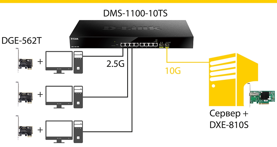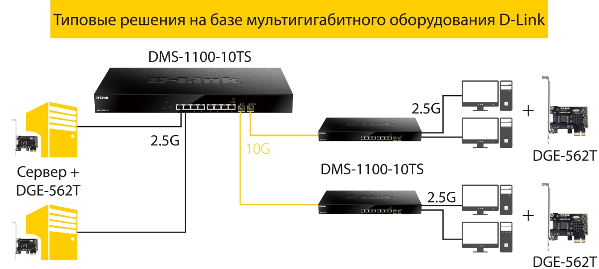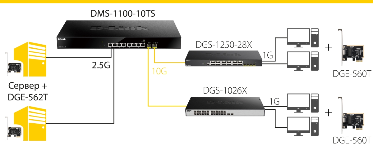 Решения на базе мультигигабитного коммутатора DMS-1100-10TS и сетевого адаптера DGE-562T предназначены для применения в крупных корпоративных вычислительных сетях и на предприятиях малого и среднего бизнеса для увеличения пропускной способности сетевой инфраструктуры без дополнительных инвестиций на модернизацию существующей кабельной системы.