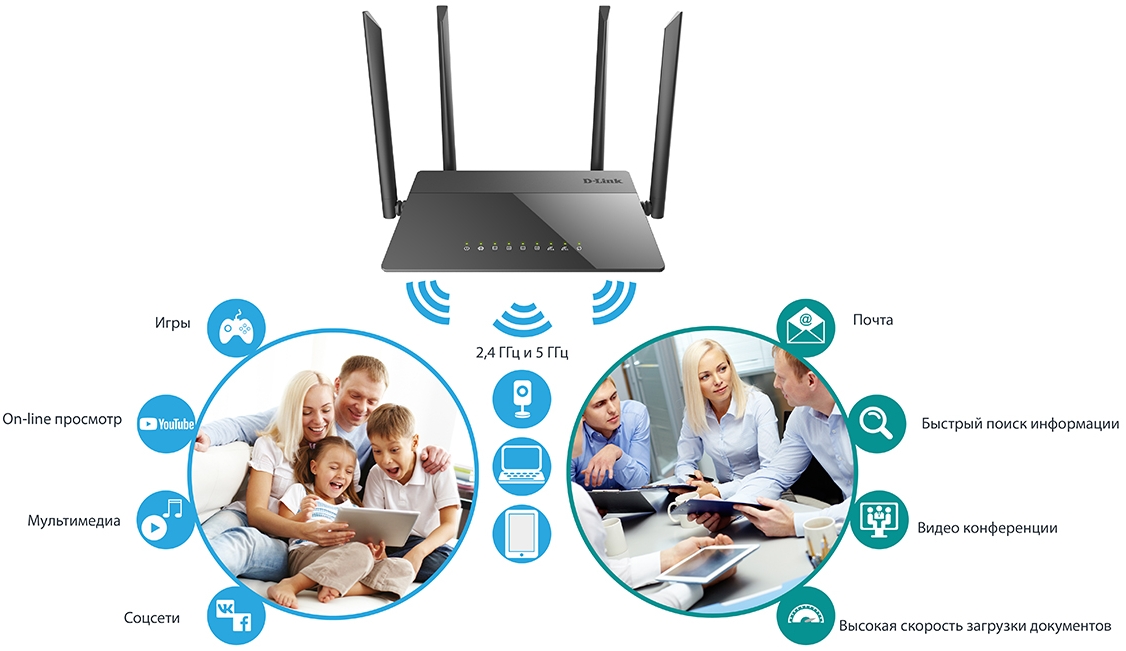 Используя беспроводной маршрутизатор DIR-841, Вы сможете быстро организовать высокоскоростную беспроводную сеть дома и в офисе, предоставив доступ к сети Интернет компьютерам и мобильным устройствам практически в любой точке (в зоне действия беспроводной сети). Одновременная работа в диапазонах 2,4 ГГц и 5 ГГц позволяет использовать беспроводную сеть для широкого круга задач. Маршрутизатор может выполнять функции базовой станции для подключения к беспроводной сети устройств, работающих по стандартам 802.11a, 802.11b, 802.11g, 802.11n и 802.11ac (со скоростью беспроводного соединения до 1167 Мбит/с)1.