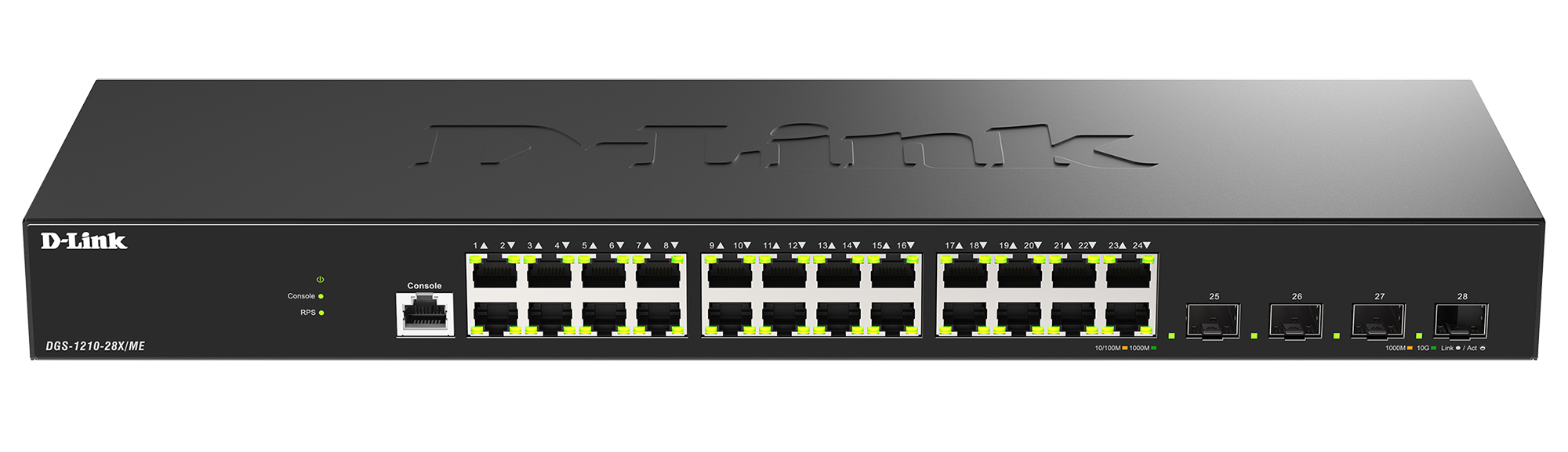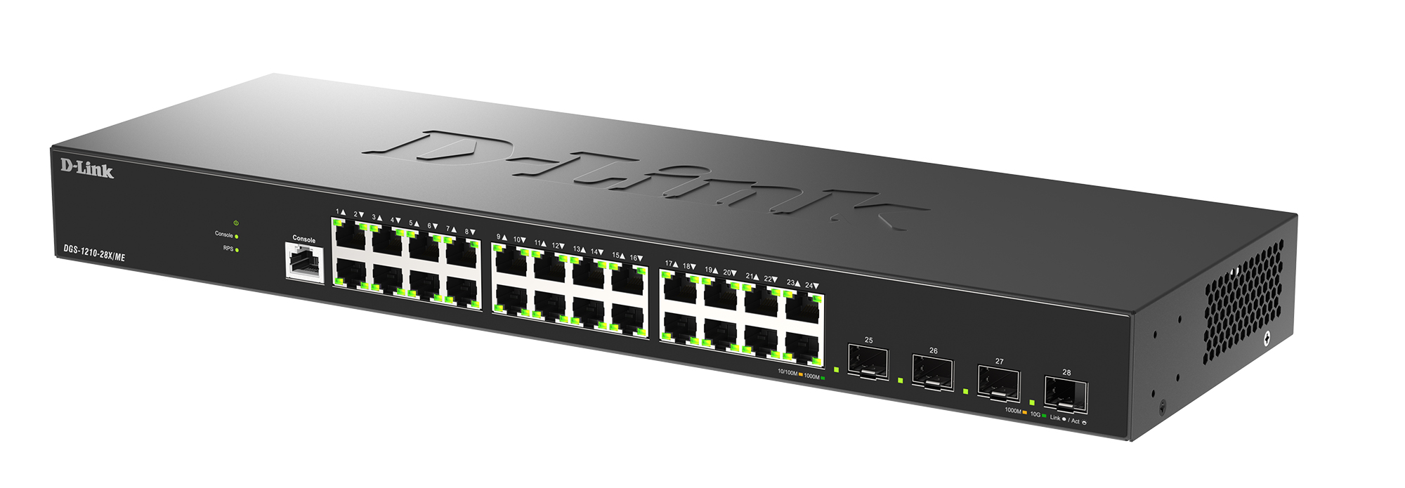 The D-Link DGS-1210-28X/ME L2 Managed Switch is an ideal solution for Metro Ethernet applications. This switch is equipped with 24 10/100/1000Base-T ports for twisted pair connection, as well as 4 10GBase-X SFP+ ports used for high-speed backbone connection. 6 kV surge protection ensures resilience against unexpected electrical spikes, while a full suite of security and management features keeps network safe from internal and external threats. The DGS-1210-28X/ME supports Auto Voice VLAN, ensuring higher priority for voice traffic.
