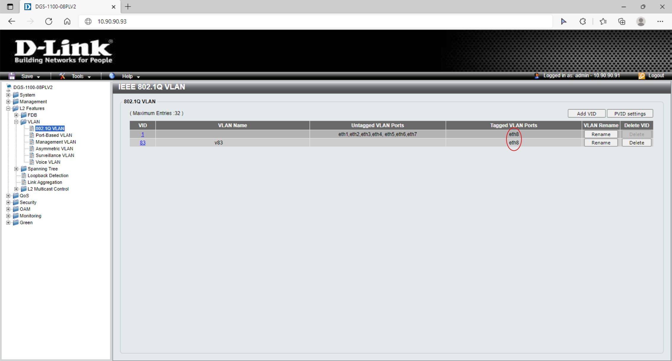3. Создайте VLAN v83, которая будет использоваться для управления коммутатором (порядок настройки VLAN 802.1Q можно узнать здесь ссылка). Добавьте порт 8 как немаркированный (untagged) в VLAN v83. Проверьте созданные VLAN.