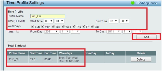 1) Создание профиля PoE_On, по которому подача PoE будет осуществляться c 3:01 до 3:00 следующего дня.
