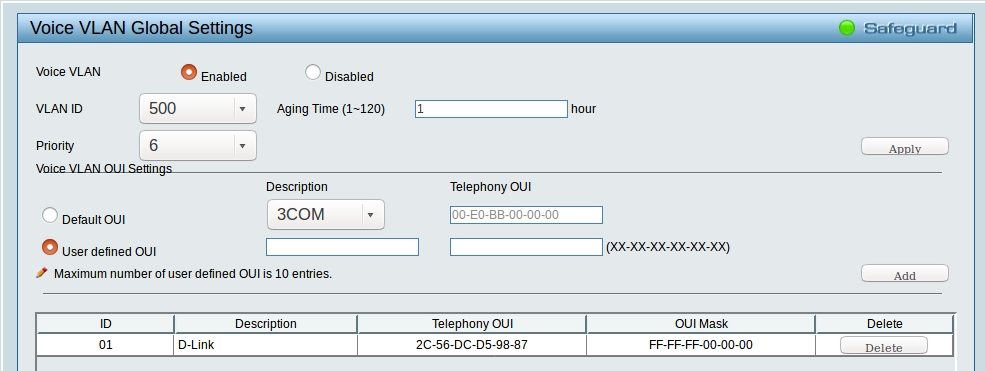 Затем в разделе Voice VLAN Global Settings нужно обозначить VLAN VOIP_1 как VOICE VLAN и добавить правило для VOIP телефонов, чтобы они автоматически попадали в VOICE VLAN.