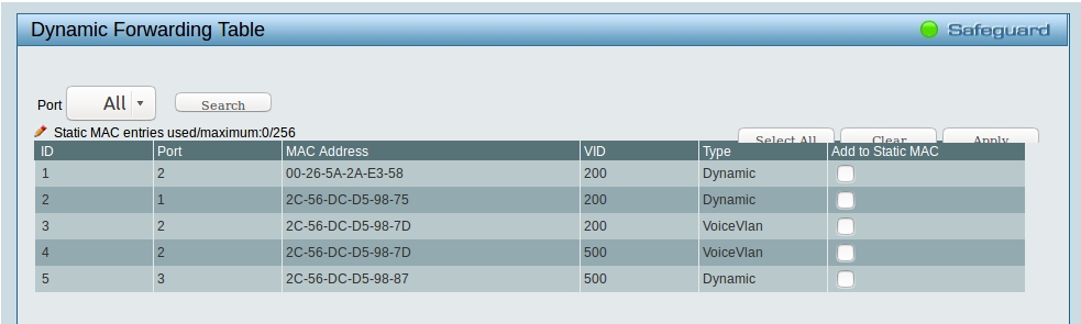 При этом в FDB таблице мы можем увидеть, что клиентские МАК адреса попали в пользовательскую vlan, а МАК адреса телефонов в VOICE VLAN.