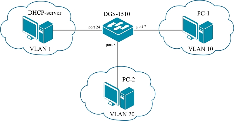 Добавляем порты в созданные VLAN. В этом примере порт 7 добавляется во VLAN 10, порт 8 добавляется во VLAN 20, а DHCP-сервер будет подключен в порт 24, находящийся во VLAN 1.