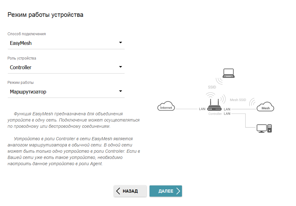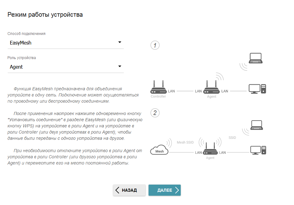 Откройте Web-интерфейс и запустите мастер настройки. На странице Режим работы устройства выберите способ подключения EasyMesh.