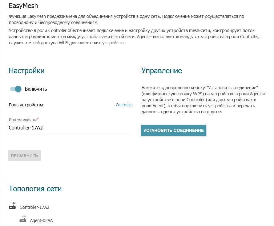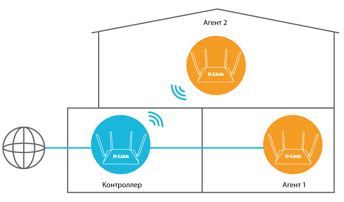 Для организации Mesh-сети необходимо два и более маршрутизатора D-Link c поддержкой EasyMesh. Один из них подключается к интернету и выполняет функции контроллера, а остальные подключаются к нему по Wi-Fi или кабелю Ethernet, расширяют беспроводное покрытие и выполняют функции агентов.
