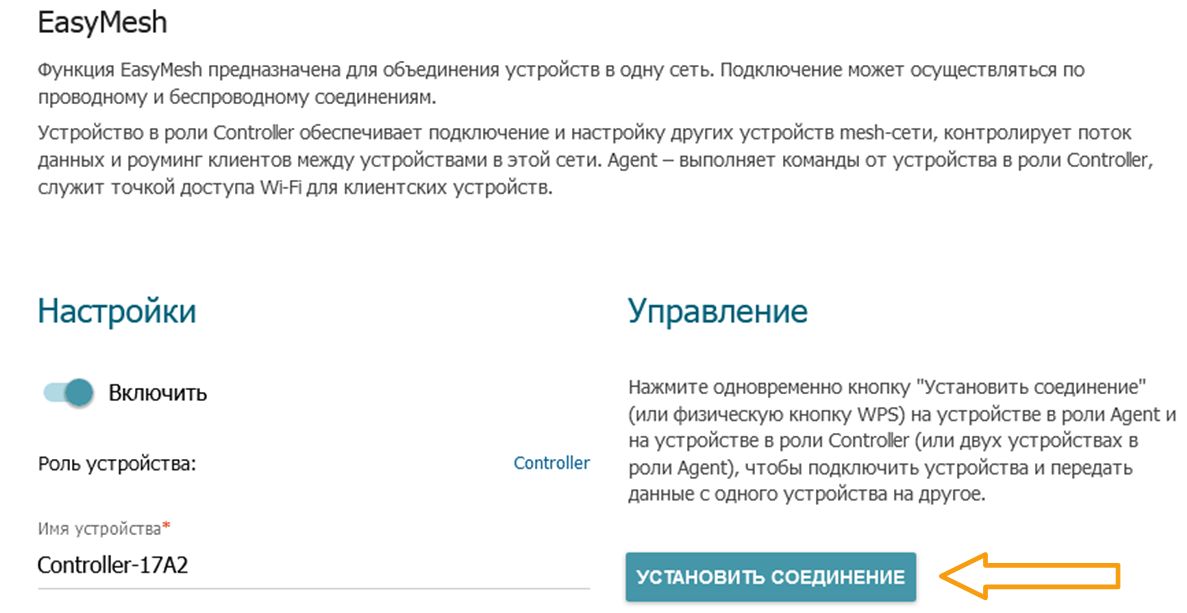 Перейдите на страницу EasyMesh агента и нажмите кнопку Установить соединение.