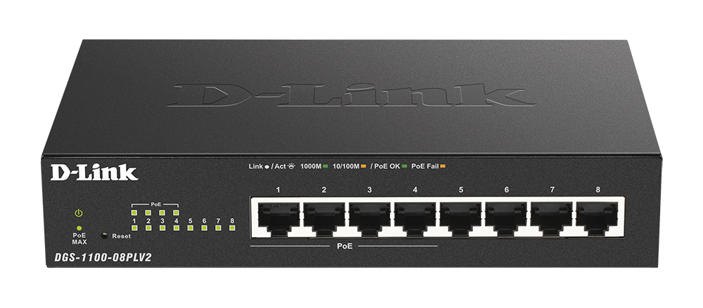 4 порта DGS-1100-08PLV2 поддерживают стандарт IEEE 802.3at PoE. Каждый порт PoE подает питание мощностью до 30 Вт при общем бюджете коммутатора 80 Вт, что позволяет пользователям подключать к DGS-1100-08PLV2 устройства, совместимые со стандартом 802.3at. Это позволяет размещать оборудование в труднодоступных местах вне зависимости от расположения электрических розеток и минимизировать прокладку кабеля.