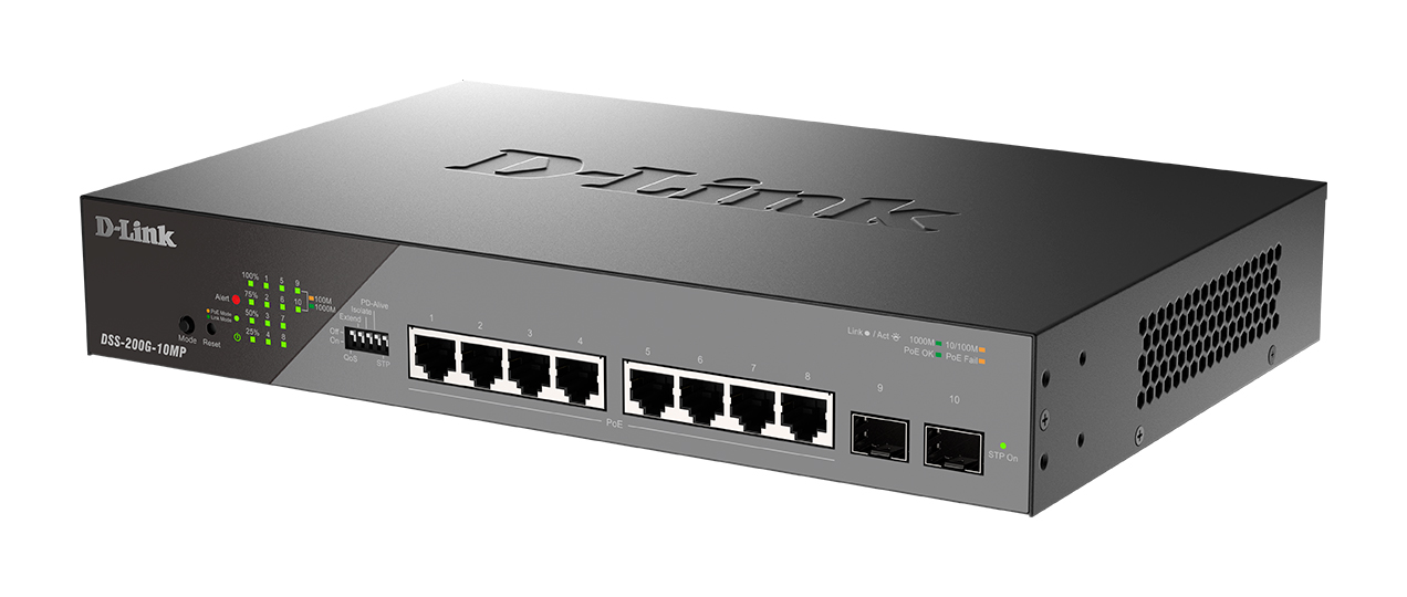 Управляемый L2-коммутатор DSS-200G-10MP, оснащенный 8 портами 10/100/1000Base-T с поддержкой PoE и 2 портами 1000Base-X SFP, предназначен для построения систем видеонаблюдения, IP-телефонии и корпоративных сетей Wi-Fi. По сравнению с серией DGS-1100V2, коммутаторы DSS-200G обладают рядом аппаратных и функциональных преимуществ, упрощающих развертывание и обслуживание современных систем видеонаблюдения и сетей с PoE. Устройства оснащены защитой от статического электричества до 6 кВ, сигнальным портом Alarm (RJ-45) и аппаратными DIP-переключателями для быстрой активации наиболее часто используемых функций без необходимости входа в Web-интерфейс. В дополнение к базовому функционалу реализована поддержка ERPS и расширенные функции управления и мониторинга PoE, включая Perpetual PoE, Fast PoE, PD Alive и подачу питания по расписанию. В Web-интерфейсе предусмотрен специальный режим для задач видеонаблюдения с возможностью мониторинга состояния портов, PoE-бюджета и автоматического обнаружения ONVIF-совместимого оборудования. Также поддерживается управление по SNMP.