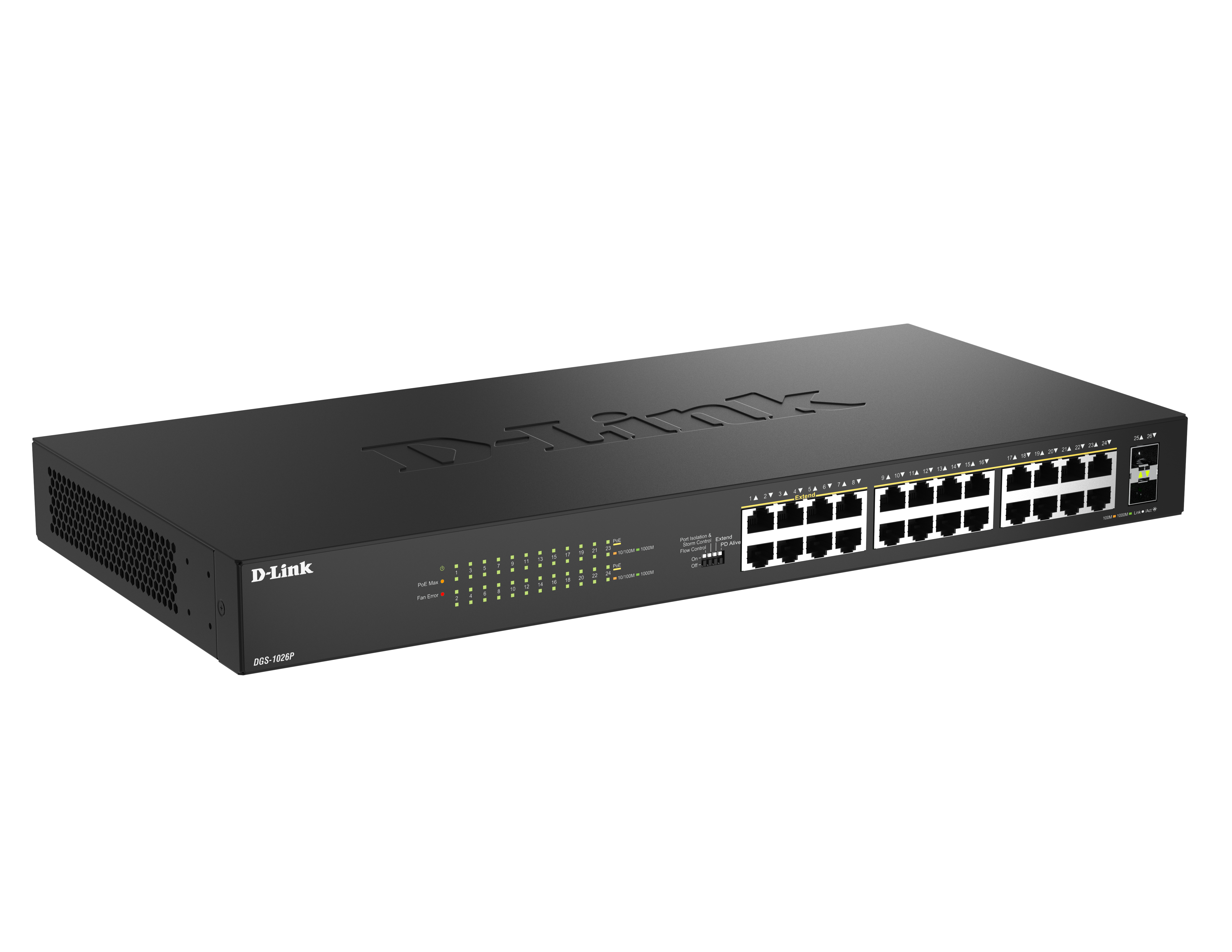 Коммутатор DGS-1026P оснащен 24 портами 10/100/1000Base-T с поддержкой PoE, 2 портами 1000Base-X SFP и DIP-переключателем с возможностью конфигурирования. Коммутатор рекомендуется для использования в сетях SOHO и предприятий малого и среднего бизнеса (SMB). Поддержка PoE позволяет пользователям легко подключать и подавать питание по Ethernet-кабелям на такие устройства, как PoE-совместимые беспроводные точки доступа, сетевые камеры или IP-телефоны.