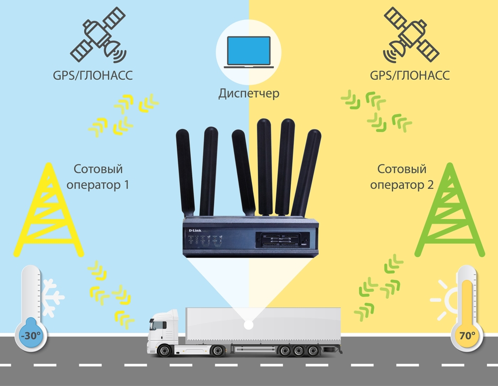 Наличие WAN-порта и поддержка 3G/4G позволяют резервировать проводное подключение мобильным и наоборот, а также балансировать нагрузку. Широкий диапазон рабочих температур (от -30 до 70 °C) обеспечивает возможность эксплуатации DWM-321D в неблагоприятных условиях окружающей среды.